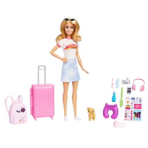 Take imaginations around the world with the Barbie Malibu Doll Travel Playset. This Barbie Malibu doll is ready for her next big adventure with her puppy and travel accessories! Decorate her suitcase with the sticker sheet, then pack her bag and luggage which both open and close to fit her travel essentials. She is ready for take-off in a cute travel outfit. In a sky-print skirt and with accessories like a kitty-shaped neck pillow, toothbrush, headphones and a toy camera, Barbie is ready for takeoff! Product Features: Includes 1 x Barbie Malibu doll, 1 x suitcase, 1 x sticker sheet, 1 x puppy figure, 1 x backpack, 1 x kitty-shaped neck pillow, 1 x toothbrush, 1 x toothpaste tube, 1 x face mask, 1 x toy hand sanitiser, 1 x sunglasses, 1 x toy phone 1 x headphones and 1 x toy camera Barbie doll’s suitcase and backpack open and close to fill with the accessories Decorate the suitcase with the sticker sheet Realistic accessories encourages storytelling and role-play Suitable for ages 3 years +