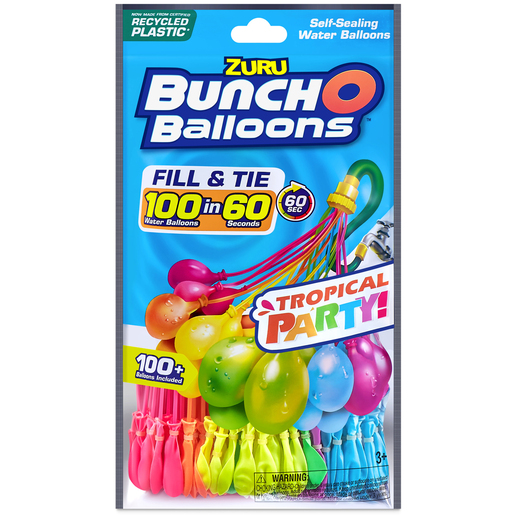 Get ready to party, with Bunch O Balloons Tropical Party Water Balloons. Fill and Tie 100 Tropical Party balloons in less than 60 seconds with these self-tying water balloons! With innovative O-ring technology and rapid fill capabilities, say goodbye to the stress and mess of filling individual water balloons and say hello to never ending splash out loud fun. Simply connect to a tap or hose, fill, and make hundreds of water balloons with no hand-tying. Take them to a pool party, to your garden, to a barbecue, or any summer occasion to unleash summer fun no matter where you are. Summer’s too short, make sure you spend it having splashing, refreshing fun! Product features: Includes 3 x Bunch O Balloons Tropical Party Stems (100+ Self Sealing, Rapid Fill Water Balloons per stem) Fill and Tie 100 balloons in 60 seconds to start a Tropical Party in minutes Simply attach the stem to a hose and make hundreds of water balloons in seconds Bunch O Balloons patented O-ring technology means there is no tying necessary The stems and caps are now made from certified and traceable, recycled plastic Approximate Dimensions: 29 x 15 x 3 cm Suitable for ages 3 years +