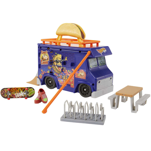 The Hot Wheels Skate Taco Truck Playset is on the move and loaded with spicy stunt areas to slide, grind and ride. Test out new tricks and master classic ones on the giant taco or the rear ramp. Blast ollies and 360s off the picnic table. The included accessories can be stored in and on the truck for total portability. The playset comes with 1 fully assembled, exclusive fingerboard that was designed in collaboration with skateboarding legend Tony Hawk and removable skate shoes that can be stored on the truck itself. Product features: Includes: 1x Taco Truck Play Case, 1x fingerboard 1x pair of skate shoes Get a taste of epic skateboarding with the Hot Wheels Skate Taco Truck The truck features a rooftop taco that can be used for awesome tricks or as a handle when taking the truck on the go Kids can pull out the grind rail, set up the vertical ramp or use the picnic table for additional skate tricks. All the included accessories fit conveniently in or on the truck for simple storage Store up to 6 boards on the outside of the truck, and open the back of the truck for additional board and skate shoe storage (Additional boards and shoes sold separately) Suitable for ages 5 years +