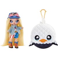 Level up your glam game with the Na. Na. Na. Surprise 2-in-1 Erika Featherton Fashion Doll and Purse. You get 2-in-1 value with a soft fashion doll plus a collectible clip-on metallic fabric animal pom purse. The glam series features eye-catching metallic fabrics in the animal-inspired doll fashions and purse which has a convenient cute, animal-shaped clip to attach to a backpack or larger purse. Na Na Na Surprise dolls are the first-ever soft, posable fashion dolls with printed face and fashion details. Key Features: Level up your glam game with the new 2-in-1 fashion doll plus metallic purse. Includes a gorgeous, soft, 7.5 fashion doll and metallic fabric purse with a clip to attach to a backpack. Erika has beautiful long blonde hair. She comes with printed face and clothing details and gorgeous Americana fashions. She is dressed up in a denim jacket with embroidery and metallic fringe, cropped t-shirt with knotted tie at the front and screenprint that says ‘Na Na Na’, American flag print shorts, patriotic trucker hat and leather boots with eagles. Soft for cuddles and poseable for display. Includes 7.5′ fashion doll, hat, one outfit, shoes and keychain animal-inspired pom purse. Hat is not removeable. Erika Featherton comes with a tag with her name, birthday and a little about her.