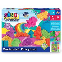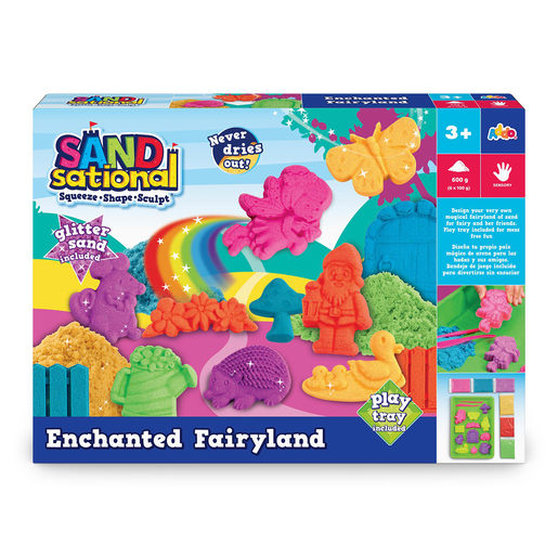 Squeeze, shape and sculpt to create plenty of magical scenes with this SANDsational Enchanted Fairyland set. This SANDsational kit promises plenty of squishy, squashy fun! Little ones will love spending their days designing their very own magical fairyland for the fairy and her happily-ever-after friends with mouldable and mesmerising glitter and bright, colourful sand and 12 moulds to choose from. The bags of sand are resealable, and the set comes with a play tray for mess free fun! Best of all, the sand never dries out so you can play again and again! Product Features: Includes: 6 x 100g bags of bright sand, 2 x tools, 12 x moulds, and 1 x play tray Tray dimensions: approx. 39.5cm (L) x 29cm (W) x 5cm (D) Suitable for ages 3 years +